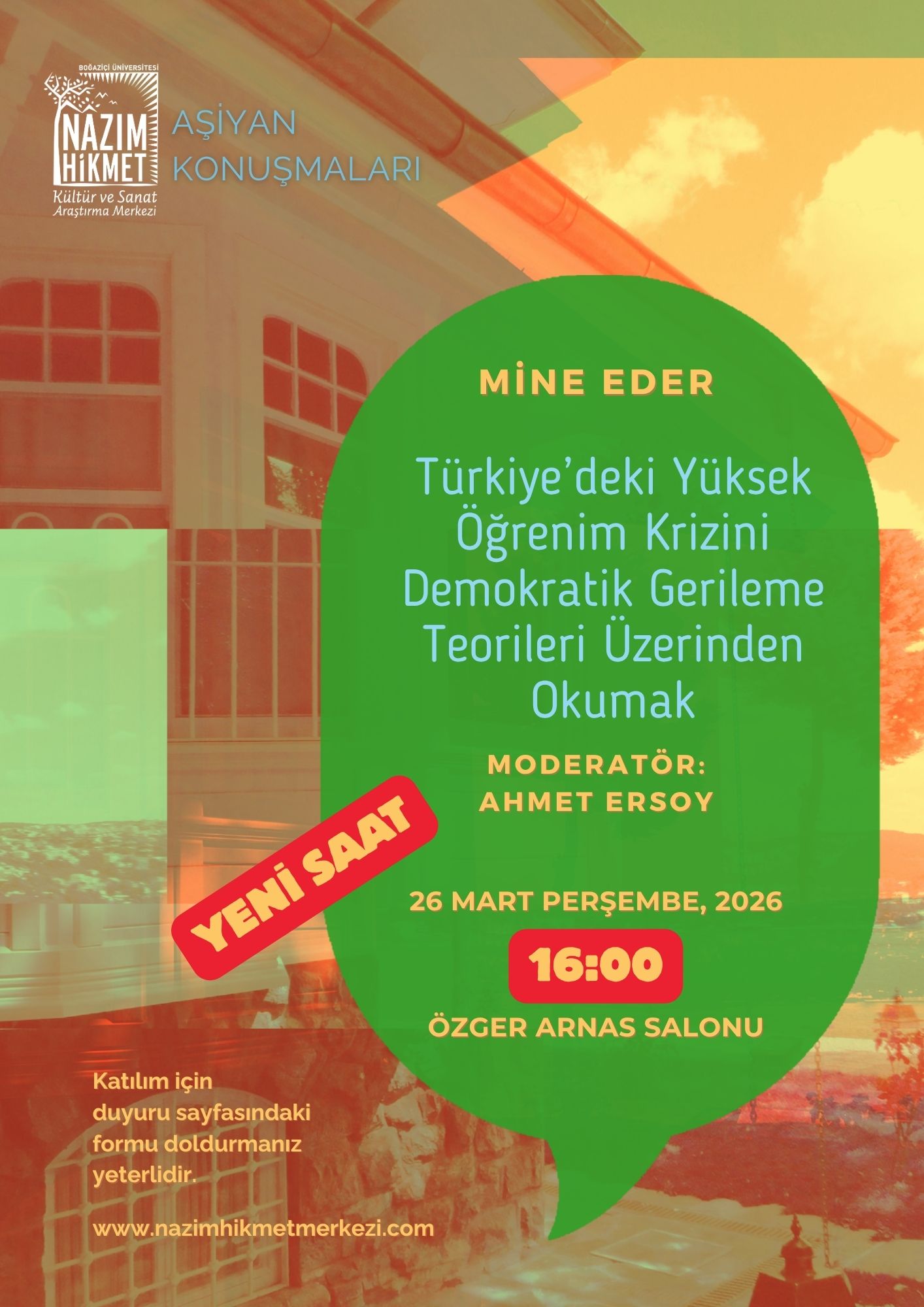 Nâzım Hikmet Kültür ve Sanat Araştırma Merkezi’nin Ekim 2021’de başlattığı etkinlik dizisi Aşiyan Konuşmaları, on yedinci bölümüyle devam ediyor. Bu konuşmada Siyaset Bilimi Bölümü Öğretim Üyesi Mine Eder, Türkiye’deki yüksek öğrenimin içinde bulunduğu krizi demokratik gerileme teorileri üzerinden okuyarak üniversiteyi ele alacak.